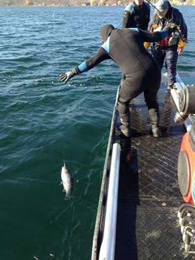 A boater who was reeling in a big fish on Canandaigua Lake, New York, on Tuesday morning was rescued after falling into the lake. A woman on the southeast shore of the lake heard the man yelling and a crew removing docks came to the man’s rescue, pulling John R. Maloney, 63, of Rochester, safely out of the lake as Maloney hung onto his fishing pole and his 2-foot long rainbow trout.