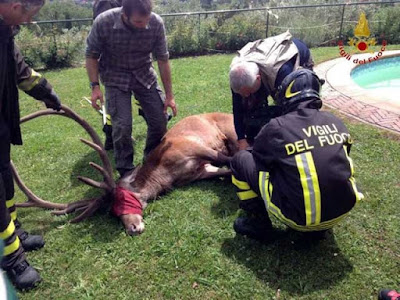 After first being shot with a tranquiliser dart, in order to prevent the animal hurting itself or its rescuers, the deer was lifted out of the pool.